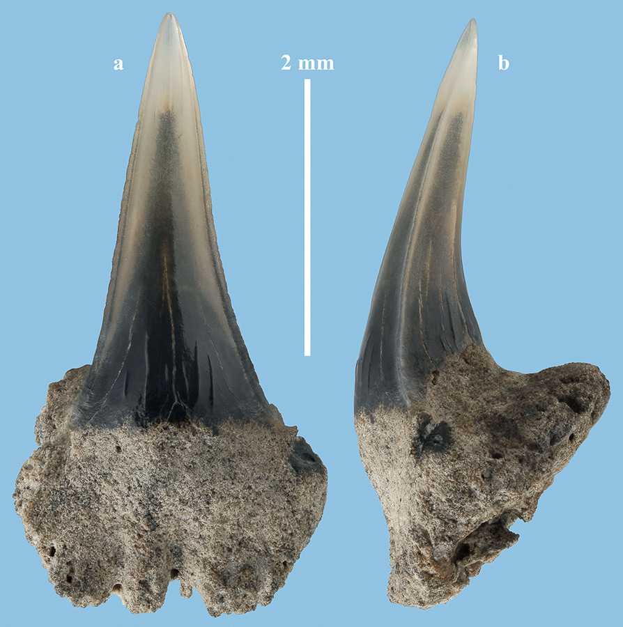 Комментарий. Частично сохранившийся "глазной" зуб. a - вид спереди; b - вид сбоку.
