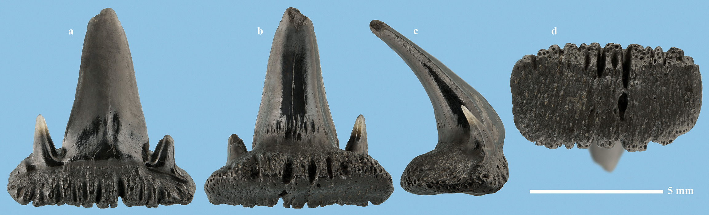 Комментарий. Передний нижнечелюстной зуб. a - вид спереди; b - вид сзади; c - вид сбоку; d - вид снизу.