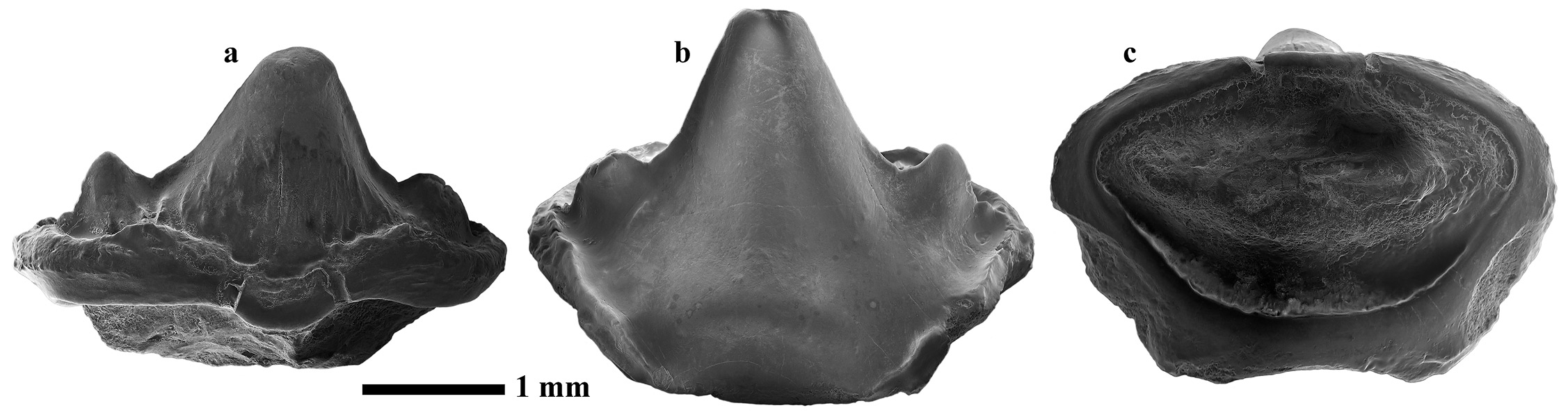 Передний (?) зуб. Корень сохранился частично, вероятно, был сломан в самом начале функционирования зуба. Благодаря этому, коронка не успела сильно стесаться