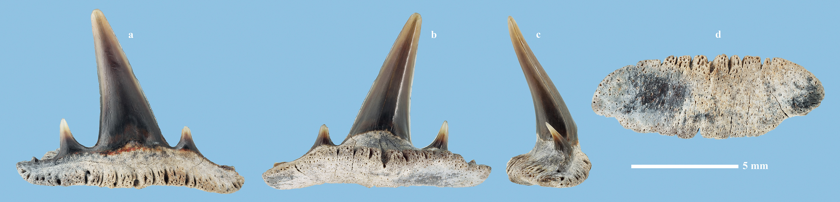 Комментарий. Боковой верхнечелюстной зуб. a - вид спереди; b - вид сзади; c - вид сбоку; d - вид снизу.