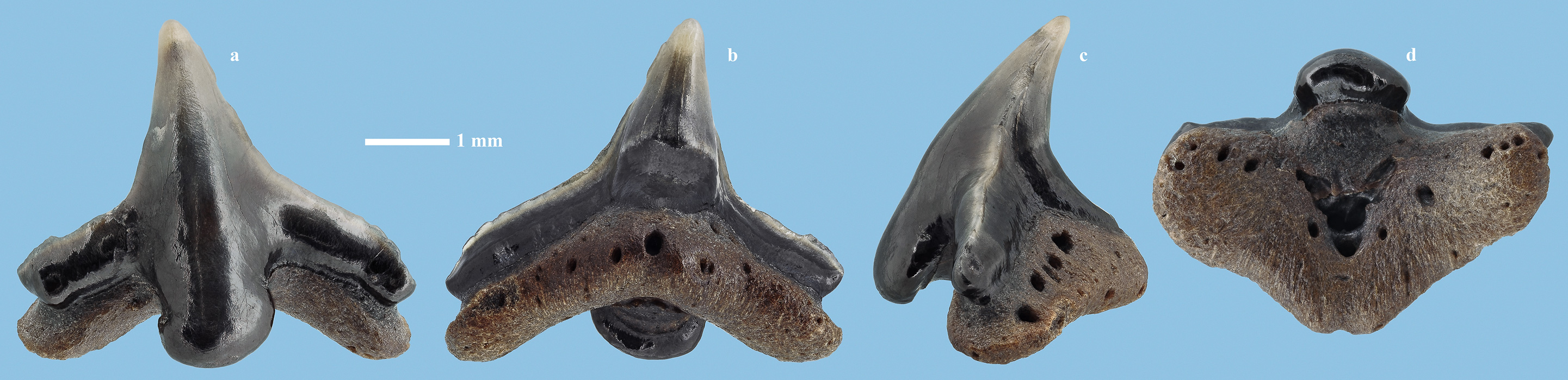 Размеры. Высота образца около 3,8 мм; ширина корня - около 4,7 мм; толщина корня - около 3,0 мм. Длина масштабного отрезка равна 1 мм.