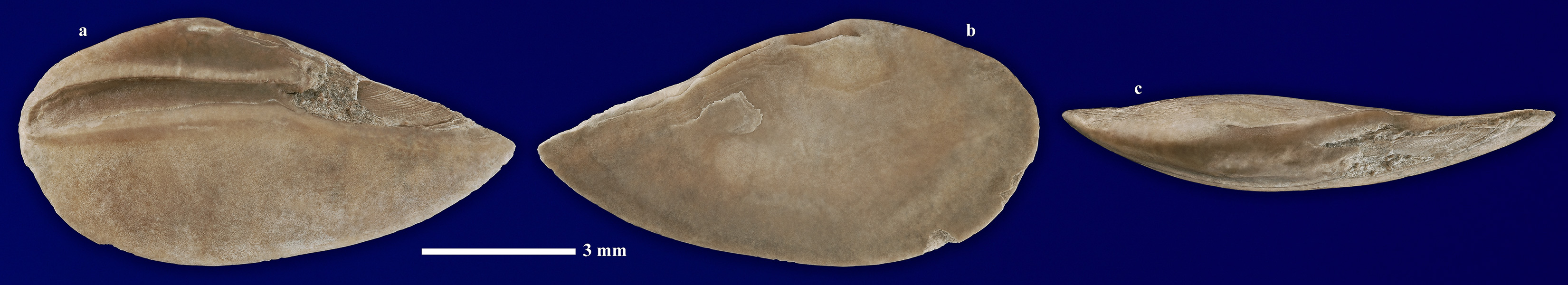 Комментарий. Отолит костной рыбы. a - вид "спереди"; b - вид "сзади"; c - вид "сверху".