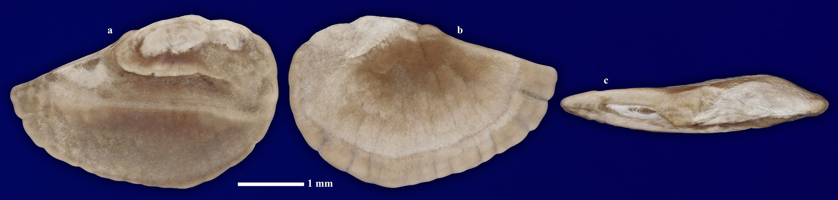 Комментарий. Отолит взрослой особи костной рыбы. a - вид "спереди"; b - вид "сзади"; c - вид "сверху".