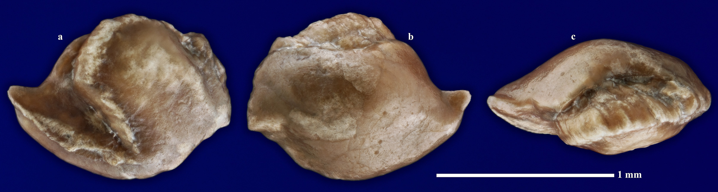 Комментарий. Отолит взрослой особи костной рыбы. a - вид "спереди"; b - вид "сзади"; c - вид "сверху".