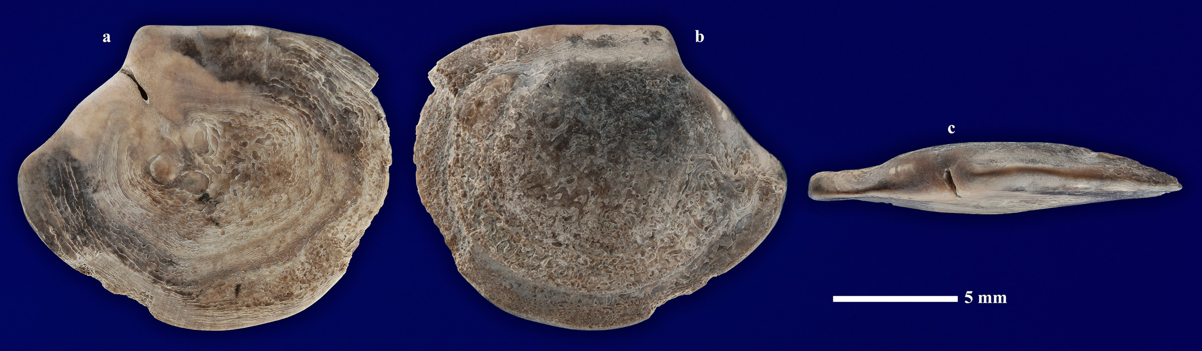 Комментарий. Отолит взрослой особи костной рыбы. a - вид "спереди"; b - вид "сзади"; c - вид "сверху".