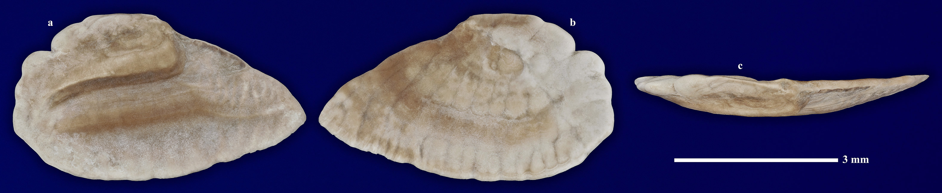 Комментарий. Отолит взрослой особи костной рыбы. a - вид "спереди"; b - вид "сзади"; c - вид "сверху".