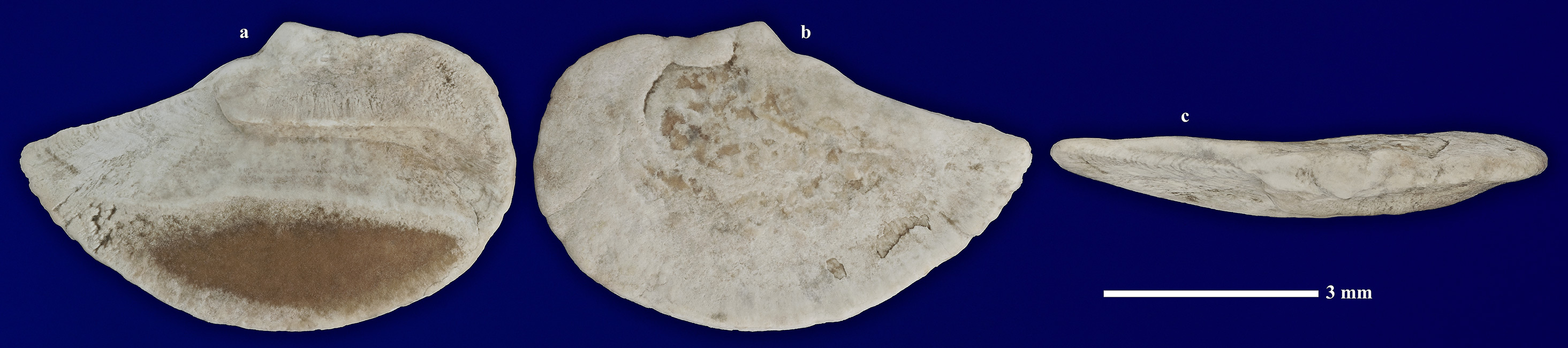 Комментарий. Отолит крупной взрослой особи костной рыбы. a - вид "спереди"; b - вид "сзади"; c - вид "сверху".