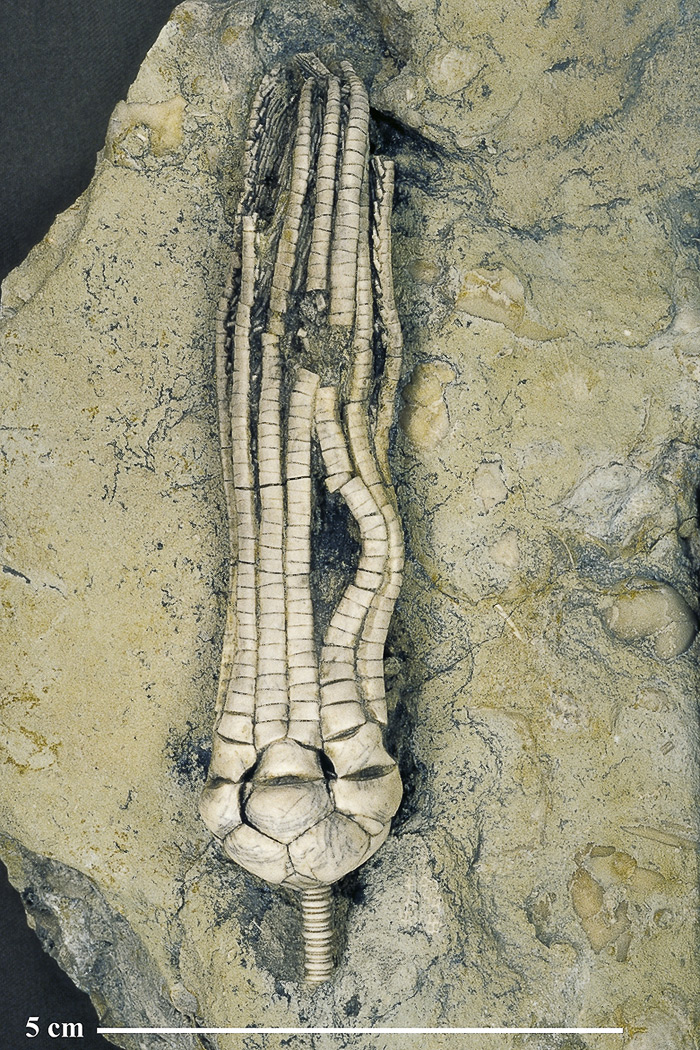 Комментарий. Крона и часть стебля ископаемой морской лилии Mooreacrinus gemminatus на вмещающей породе.