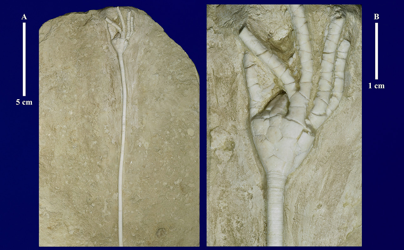 Крона ископаемой морской лилии с частью стебля на вмещающей породе.