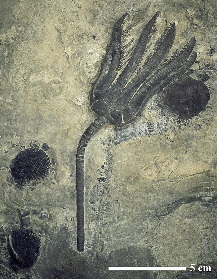 Комментарий. Крона и часть стебля ископаемой морской лилии Encrinus liliiformis на вмещающей породе совместно с раковинами двустворчатых моллюсков.