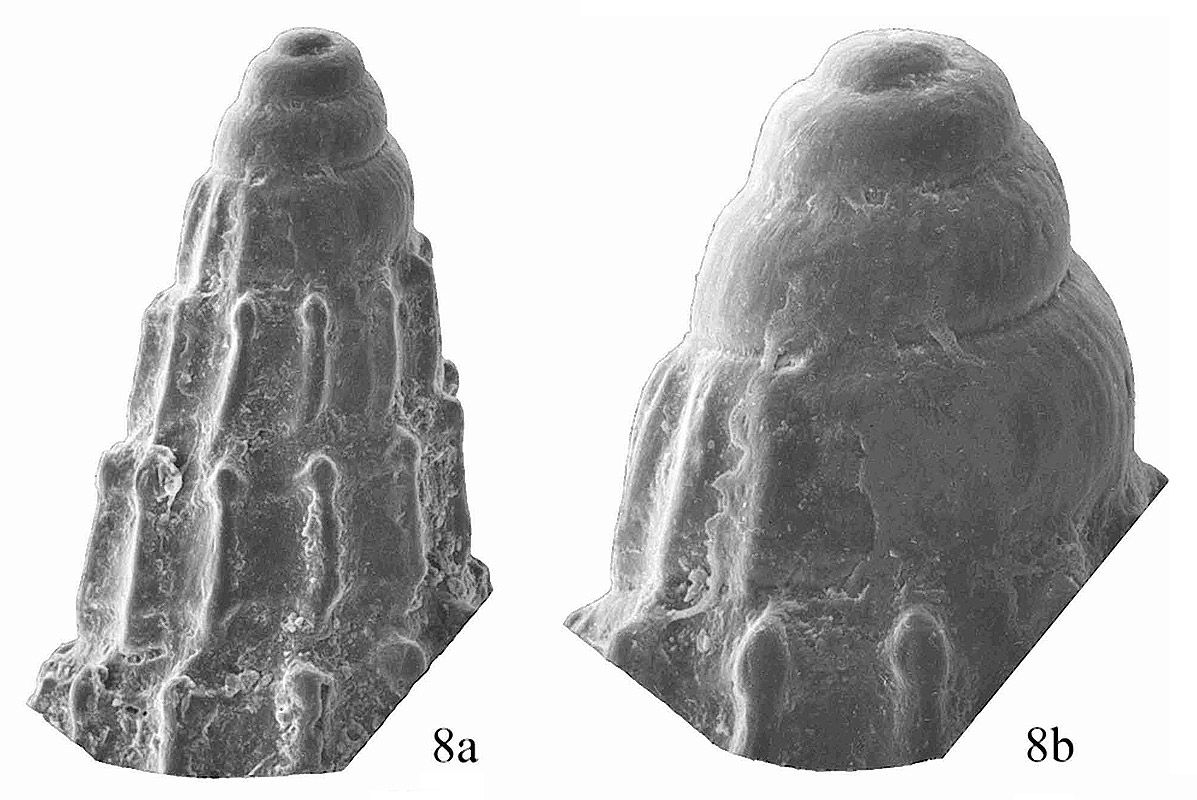 8 a) Протоконх с первыми оборотами телеоконха (x 36); 8 b) протоконх ( x 79).
