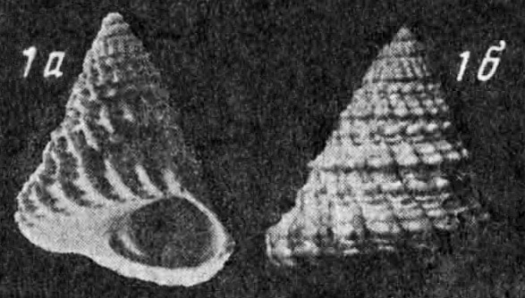 Раковина с сохранившимися протоконхом и устьем. 1 а - вид со стороны устья; 1 б - вид со стороны, противоположной устью.