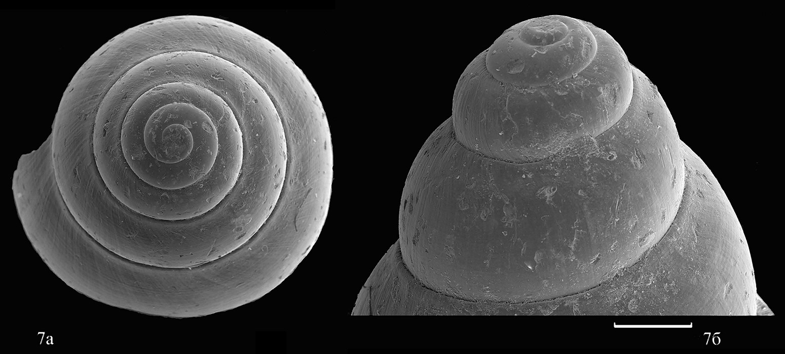 7 а: вид вершины сверху (диаметр раковины 2.25 мм); 7 b: вид вершины сбоку (масштабная линейка - 0.3 мм).