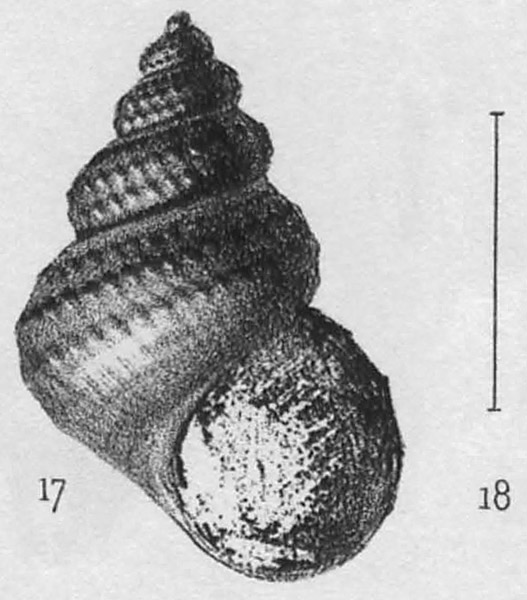Внутреннее ядро или раковина без наружнего слоя. 17) вид со стороны устья; 18) натуральная величина образца