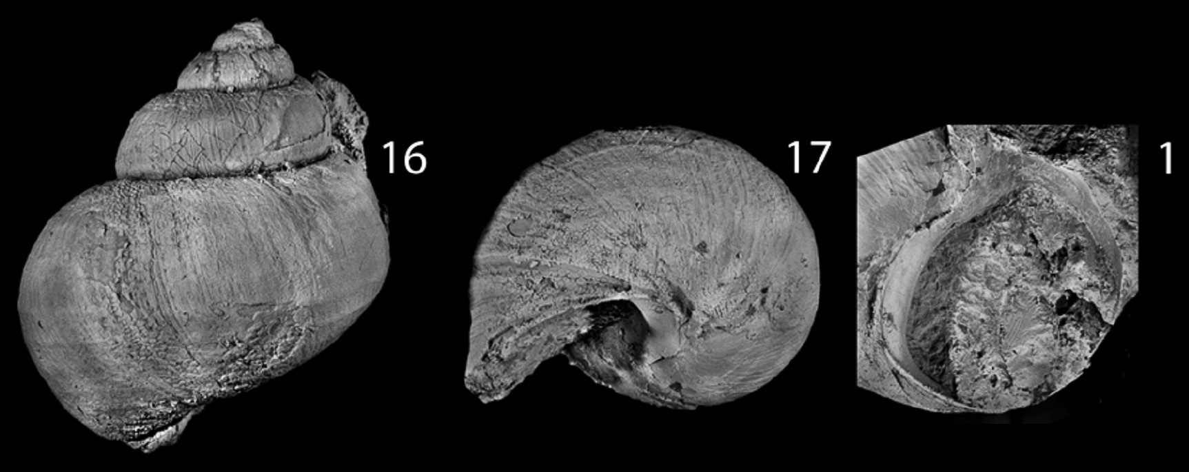 Раковина ископаемого брюхоногого моллюска. 16 - вид со стороны, противоположной устью; 17 - вид снизу; 1 - устье раковины.