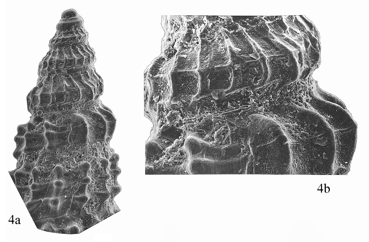 4 a: протоконх раковины (x 47); 4 b: микроскульптура протоконха (x 105).