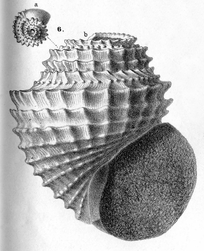 Раковина без начальных оборотов. 6 a - вид сверху; 6 b - вид со стороны устья (сильно увеличено).
