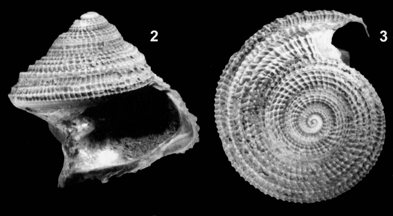 Раковина молодой особи с сохранившимся протоконхом. Fig. 2 - вид со стороны устья; Fig. 3 - вид сверху.