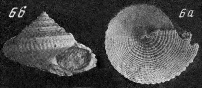 Раковина молодой особи с сохранившимся ? протоконхом. 6 б - вид со стороны устья; 6 а - вид снизу.