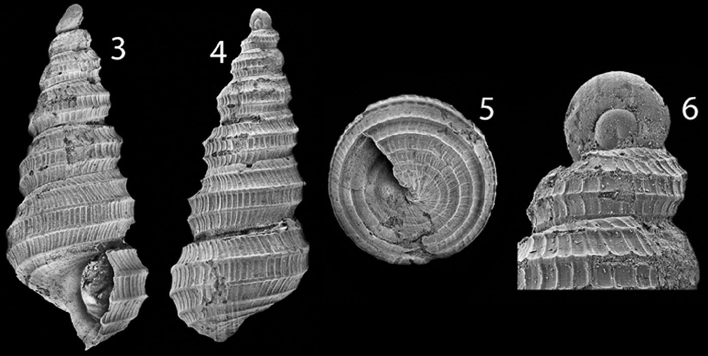 3 - вид сбоку от устья; 4 - вид со стороны, противоположной устью; 5 - вид снизу (увеличено); 6 - начальные обороты раковины (увеличено).