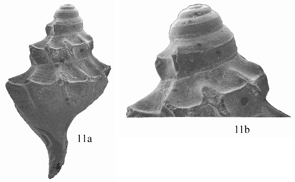 11 a: вид со стороны, противоположной устью (x11);     11 b: протоконх (x24).