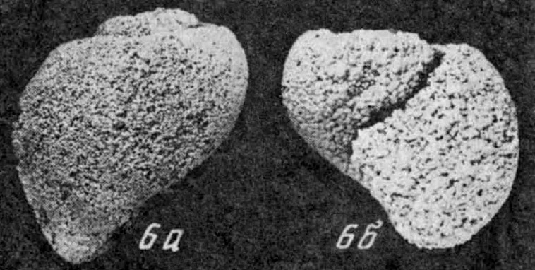 Внутреннее ядро раковины. 6 а - вид со стороны, противоположной устью; 6 б - вид со стороны устья.