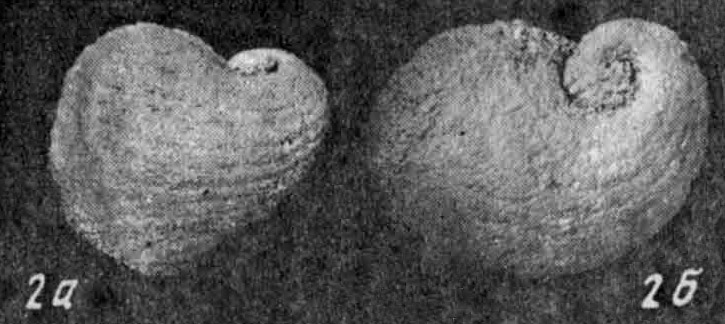 Внутреннее ядро раковины. 2 а - вид со стороны, противоположной устью; 2 б - вид сверху.