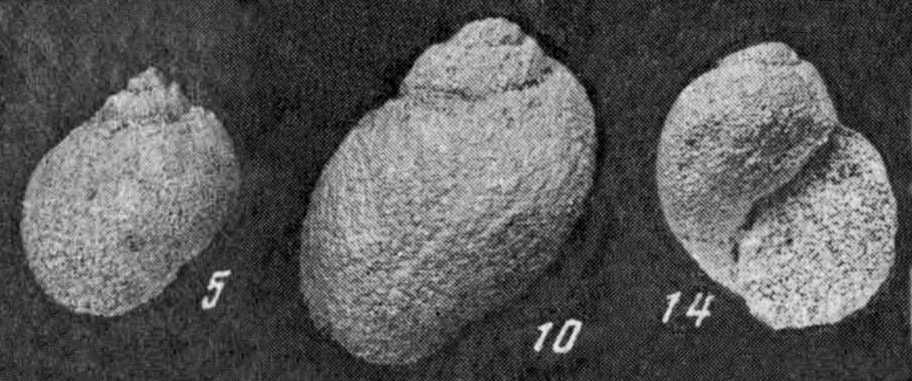 Внутренние ядра раковин. 5 - вид со стороны, противоположной устью; 10 - вид сбоку от устья; 14 - вид со стороны устья.