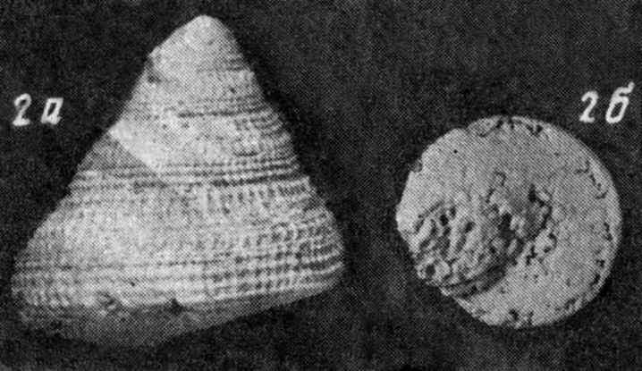 Раковина небольшой особи, замещённая кальцитом. 2 a - вид со стороны, противоположной устью (x5); 2 b - вид снизу (x2).