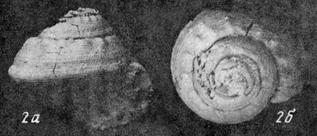 Раковина без начальных оборотов. 2 а - вид со стороны устья; 2 b - вид сверху.