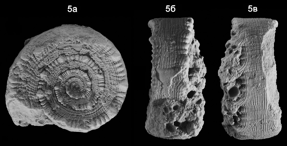 Раковина, замещённая кальцитом. 5 а - вид снизу; 5 б, 5 в - вид сбоку.