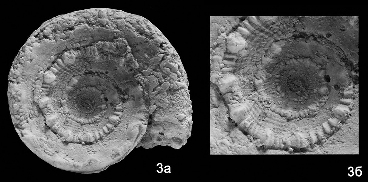 Раковина, замещённая кальцитом. 3 а - вид сверху; 3 б - детали морфологии.