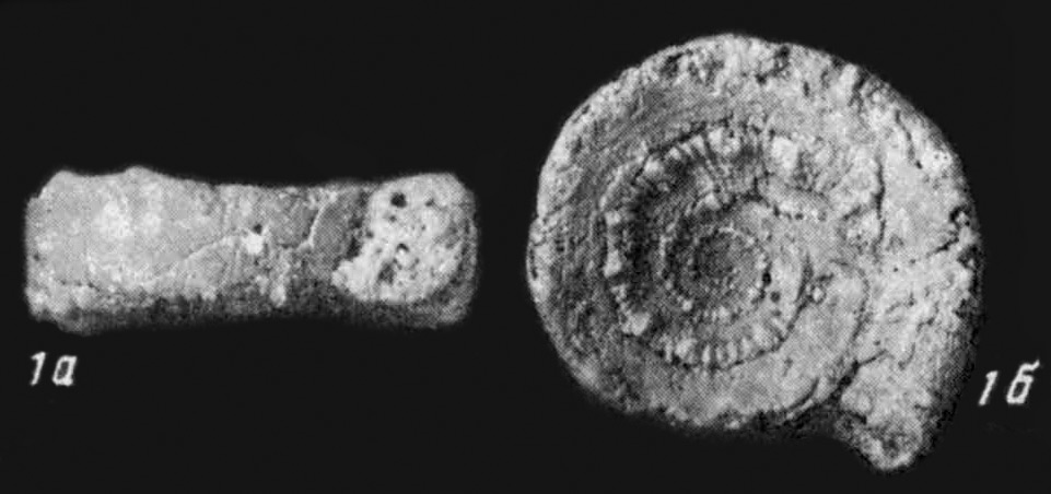 Раковина, замещённая кальцитом. Фиг. 1 а - вид со стороны устья; фиг. 1 б - вид сверху.