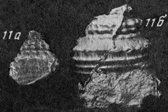 Слепок (металлическая отливка) с отпечатка раковины во вмещающей породе. 11 а - вид сбоку от устья;