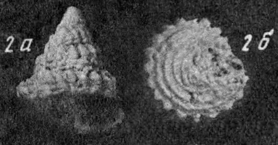 Раковина, замещённая кальцитом. 2 а - вид со стороны устья; 2 б - вид снизу.