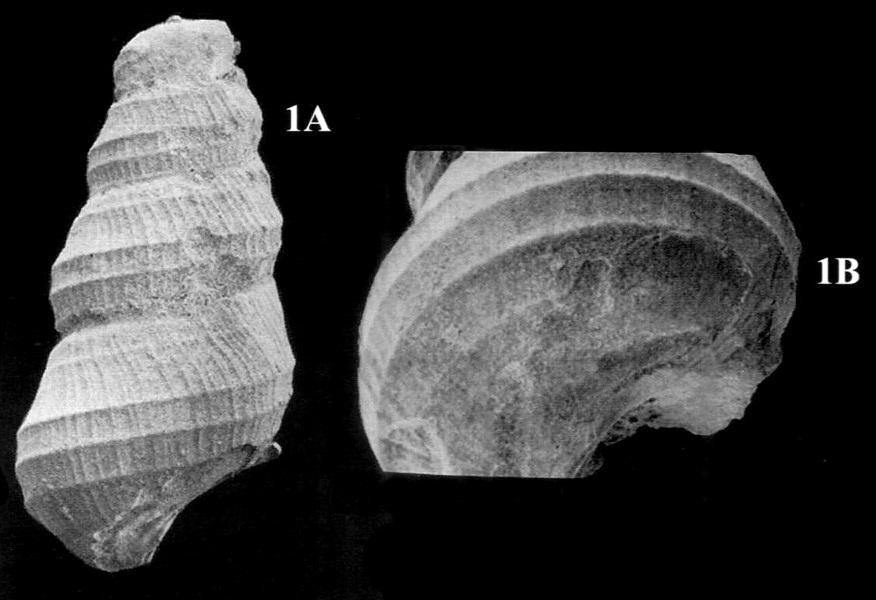 Частично сохранившаяся раковина. 1 a - вид сбоку от устья; 1 b - вид снизу-сбоку.