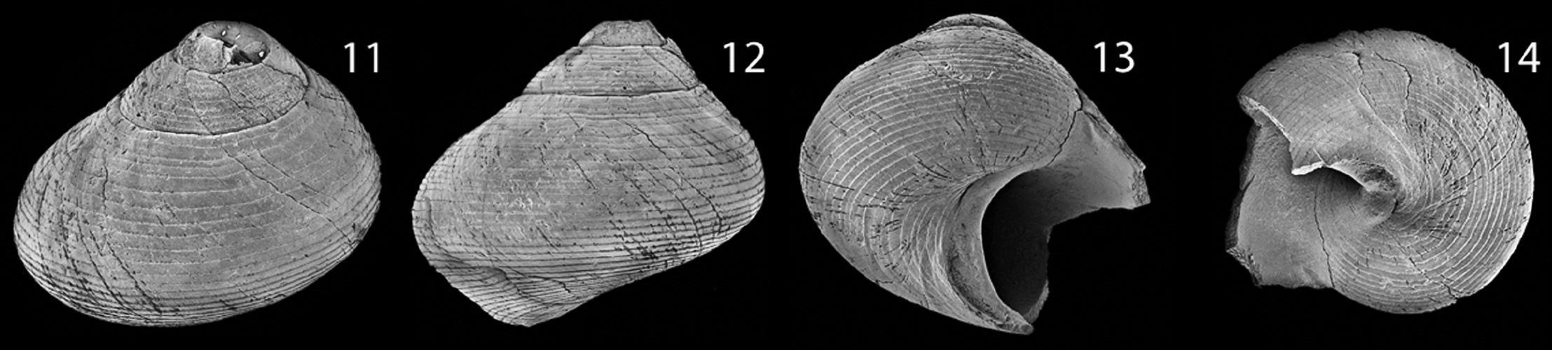 Частично сохранившаяся раковина ископаемого брюхоногого моллюска. 11, 12 - вид сбоку; 13 - вид со стороны устья, снизу; 14 - вид снизу.