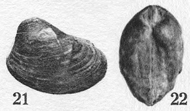 Раковина. 21 - вид со стороны правой створки; 22 - вид сверху.