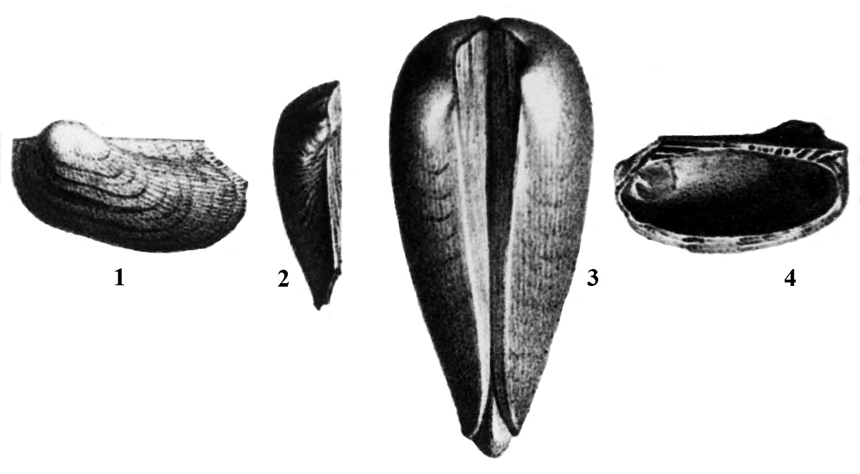 1, 2, 4 - Левая створка раковины небольшой особи: 1 - вид с наружной стороны; 2 - вид сверху; 4 - вид с внутренней стороны.