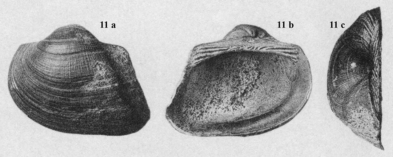 Левая створка раковины. 11 a - вид с наружной стороны; 11 b - вид с внутренней стороны; 11 c - вид сверху.