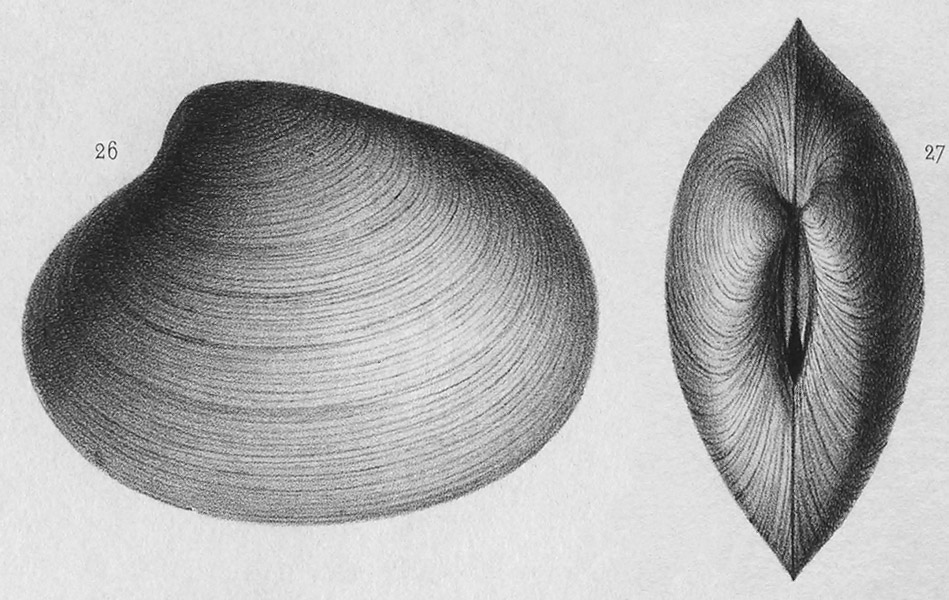Раковина. 26 - вид стороны левой створки; 27 - вид сверху.