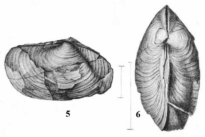 Раковины двух разных экземпляров. 5 - вид со стороны левой створки; 6 - вид сверху.