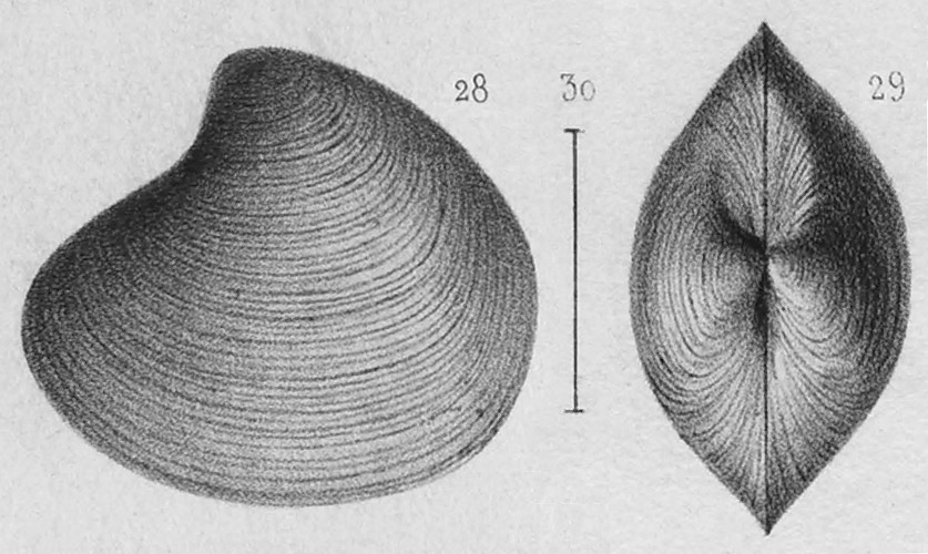 Раковина. 28 - вид стороны левой створки; 29 - вид сверху; 30 - размер образца (верно только для ориг. оттиска).