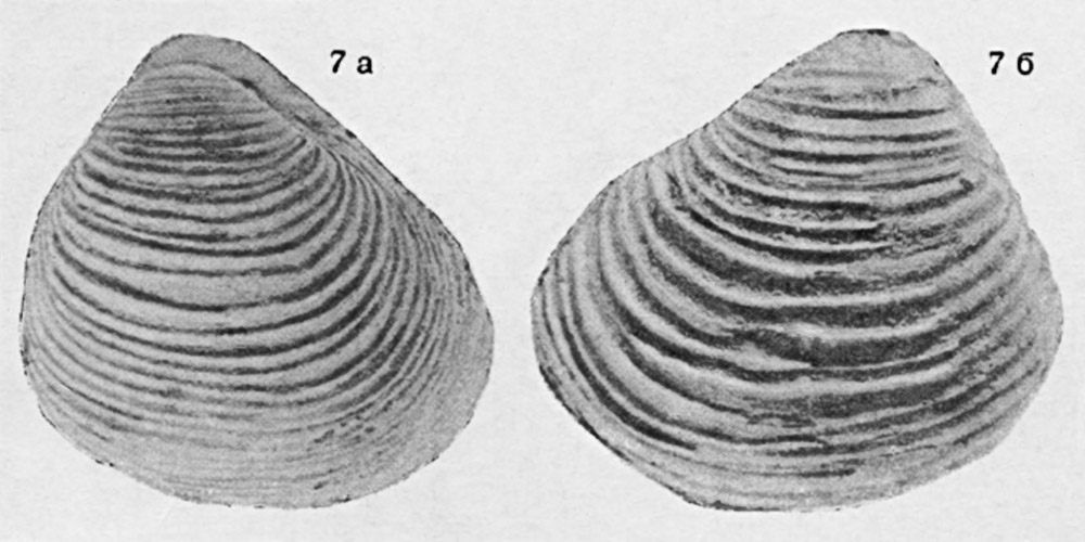 Раковина крупной особи. 7 а - вид со стороны левой створки; 7 б - вид со стороны правой створки.