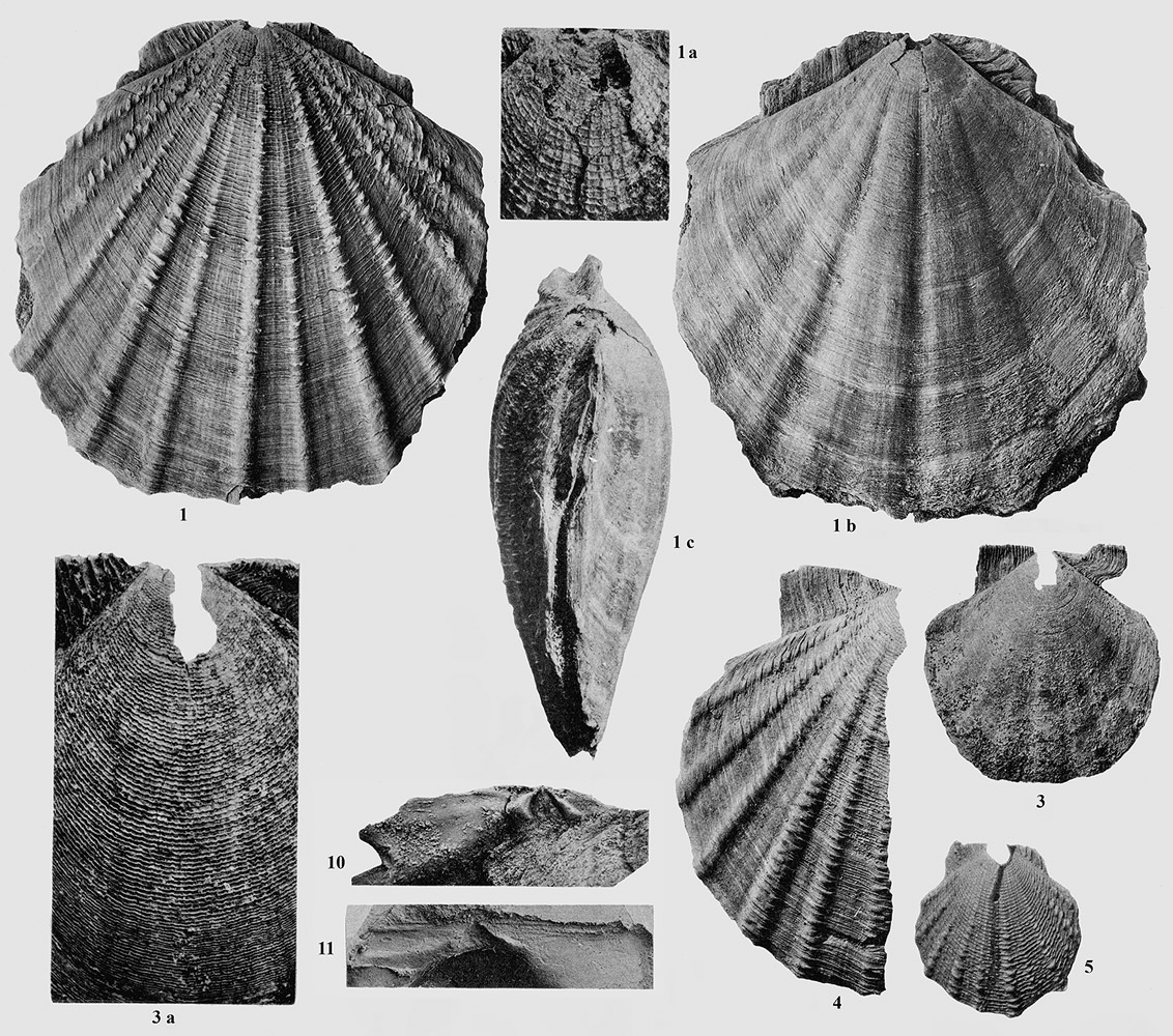 1 - Раковина крупной взрослой особи. 1 - вид со стороны левой створки; 1 a - часть поверхности левой створки (у макушки) в увеличенном виде;