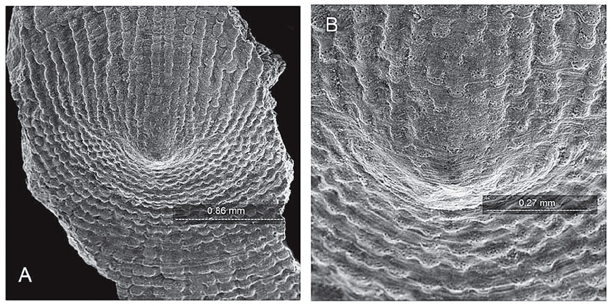 Комментарий. Изображение из: Sirenko, 2013, фиг. 3 A, B - хвостовой щиток (tail valve). Вид сверху (dorsal view). Скульптура внешней поверхности (ornamentation of antemucronal and postmucronal areas).