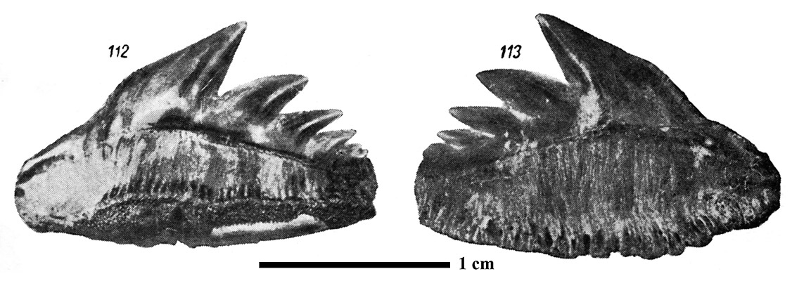 Передне-боковой ? нижнечелюстной зуб. 112 - вид сзади; 113 - вид спереди.