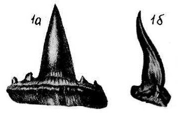 Предположительно, боковой верхнечелюстной зуб. 1 а - вид сзади; 1 б - вид сбоку.