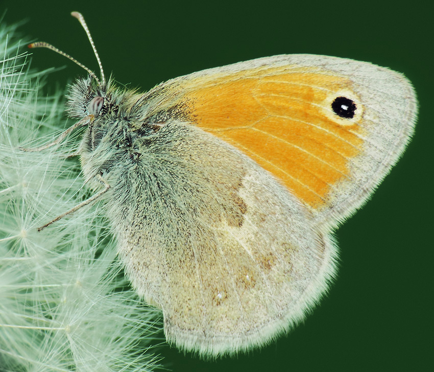 Комментарий. Бабочка сенница обыкновенная (Goenonympha pamphilus) на пушинках одуванчика (Taraxacum officinale).