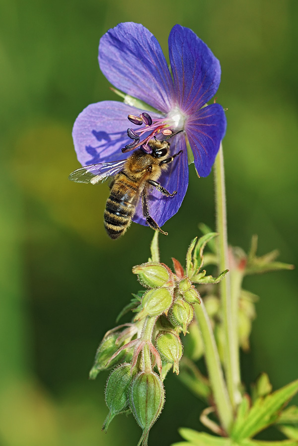 Комментарий. На влажных лугах в долине Серебрянки цветёт герань луговая (Geranium pratense), или журавельник луговой - растение из семейства Гераниевых (Geraniaceae) с крупными и удивительно красивыми цветками, окраска лепестков которых меняет свой цвет, в зависимости от времени суток: с голубовато-фиолетового в полдень, до лилово-синего и даже лилово-пурпурного с наступлением вечера.